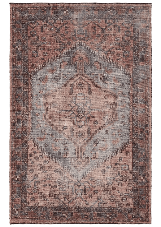 Nostalgic medallion motifs with a modern reinterpretation. The Theo collection features a vintage-inspired design complemented by rich yet distressed shades of pink, blue, and gray. A digital print is layered on a handwoven base, offering durability and easy care?with a luxe, high-end look.